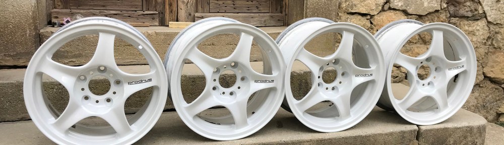 A set of Prodrive GC-05A DT wheels. Prodrive was always strong player in rally, mostly as partner with Subaru. These wheels though, were made specifically for Impreza’s biggest rival – Mitsubishi Lancer EVO. Slightly more aggressive offset makes this set ideal for a range od japanese cars, such as Honda Civic, Integra, Mazdas, Lan EVO etc. Strong and lightweight, just under 6kgs each. Very good condition, no kerb marks, front side was recently repainted in arctic white colour, also new vinyl stickers.